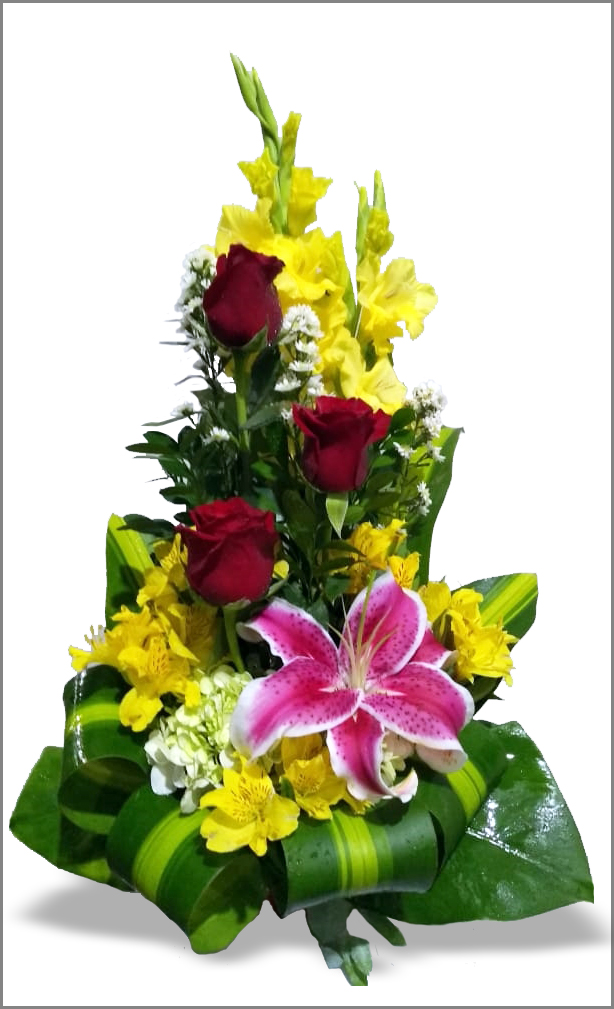 Detalle con Rosas rojas, Lilium y Gladiolos